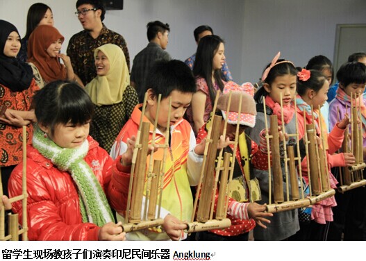 在联欢中,印尼20多名留学生为同心儿童院的孩子们表演了Angklung合奏。Angklung是印尼特有的一种民间乐器,用中空的竹子做成,每个人负责一个音,要一群人配合才能演奏出一首曲子。留学生们在台上表演,台下的孩子们也跃跃欲试。于是,印尼留学生们邀请儿童院的孩子们上台,现场教大家演奏。孩子们每人手拿一把Angklung,按照乐器所能演奏出的音符排好队。留学生们用手比划不同音符,孩子们就有秩序地晃动手中的乐器,发出叮叮当当的音乐声,不一会,孩子们竟然可以合奏出一两句《月亮代表我的心》了。