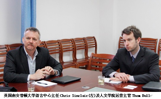 12月4日上午,英国南安普顿大学语言中心主任Chris Sinclair及人文学院运营主管Thom Bull一行来访我院。学院院长郑通涛教授、办公室主任黄冠华、英语组及项目部相关老师共同接待了来访嘉宾。
