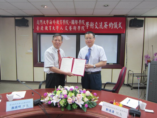 在谈到艺术方面的合作,郭博州主任和黄玲玉主任表示,北教大周边多处设有画廊,艺术氛围良好;厦大具有浓厚的人文气息,国际学院在培养艺术学生方面独树一帜,两校师生未来可以互相交流,探讨学术,这对学科发展是十分有利的。颜国明院长对此表示十分赞同。最终,双方合作意向达成一致,台北教育大学人文艺术学院与我院正式签订学术交流合作协议,会谈在亲切友好的气氛中结束。