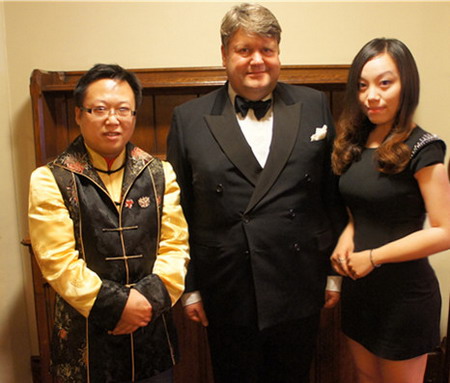 (左起:英国华夏文化交流协会会长贝学贤、上议院议会领袖拉思克莱德勋爵、杨铮)