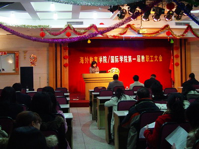 学院院长郑通涛教授向大会做工作报告,他向全院教职工汇报2007-2008年度海外教育学院的工作情况及2009年学院的工作规划,内容包括发展人才培养、学科建设、科研工作、各层次教学、制度建设以及财政收支等方面情况;同时还就国际学院三年来所取得的成绩做了说明。他指出,目前两院合并,虽然业务范围不同,但互补性很强, 今后应当加强合作,共享资源。目前海外教育学院面临着诸多发展瓶颈问题,学院正在努力解决,2009年学院生源因全球金融危机而面临着的新的压力,为此,学院要求全院教职工一起努力,共渡难关。国际学院目前逐步走向完善,应当面向世界,力争建立国内一流的国际学院,逐步与世界接轨。目前在学院发展过程中还存在不足和需要完善之处;他希望各位教职工精诚团结、努力工作,为学院的繁荣和发展做出贡献。