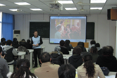 第一堂课是由武汉理工的江文辉老师讲授的英语视听课。他将一个班级的同学分成4组,他设计的教学PPT中穿插着多媒体情景对话片断,通过现场观看,学生可抢答,或要求同学回答情景对话片断中所表述意思,或要求同学表演情景对话片断中的肢体语言,以此了解英国人口语和肢体语言的习惯,使同学们了解中英两国在文化和思维上的差异。江老师又将课堂自然引伸到中国文化和风景名胜古迹,以备学生将来出国留学时更好地介绍自己的祖国。通过对学生们PK的打分,调动起课堂上同学们的积极性,课堂气氛活跃,效果明显。