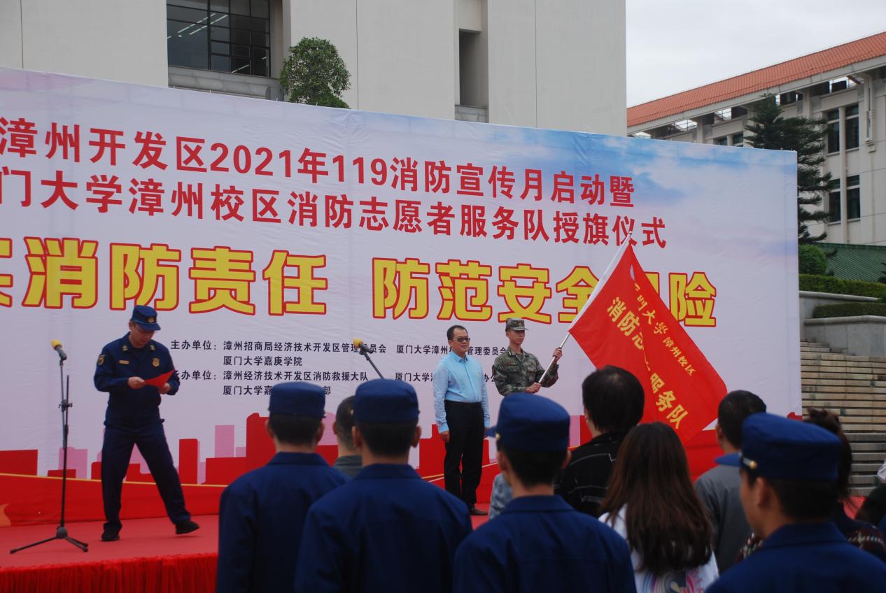 演练结束后,举行招商局漳州开发区——厦门大学漳州校区2021年“119”消防宣传月启动仪式暨厦门大学漳州校区消防志愿者服务队授旗仪式。