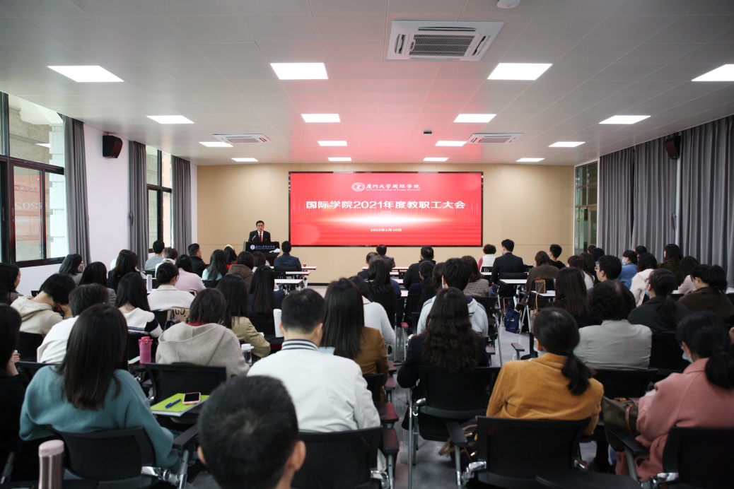 1月10日下午,国际学院2021年度教职工大会在漳州校区4号楼101会议室举行。学院党政领导班子成员及全体教职员工参加会议。