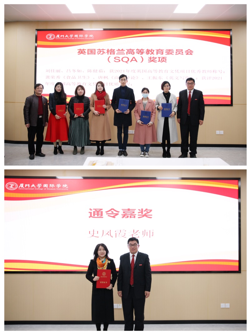 最后,学院对2021-2022学年秋季学期获得校级、英国苏格兰高等教育委员会(SQA)奖项的教职员工进行表彰,特别给予指导学生获得“全球最佳酒店接待冠军杯”中国赛区冠军及三等奖的史凤霞老师通令嘉奖。
