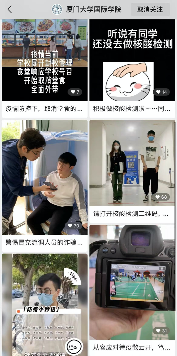 在此次校园封闭式管理期间,她积极引导学生发挥特长,用自编自导自演的方式,录制了防疫妙招、积极配合核酸检测、反校园诈骗、积极响应食堂全面外带政策等校园学习生活示范等主题微视频。另外,钟民栋、张飞霞、吴心瑜、苏璟等辅导员,也纷纷指导学生通过镜头,记录防疫期间的校园生活,传递正能量。截至3月25日,在学院官方视频号共推出7期,浏览量达12,990余次。
