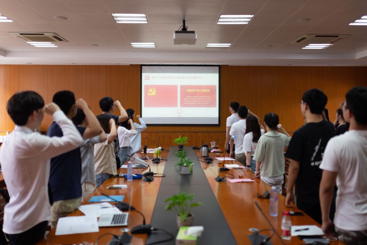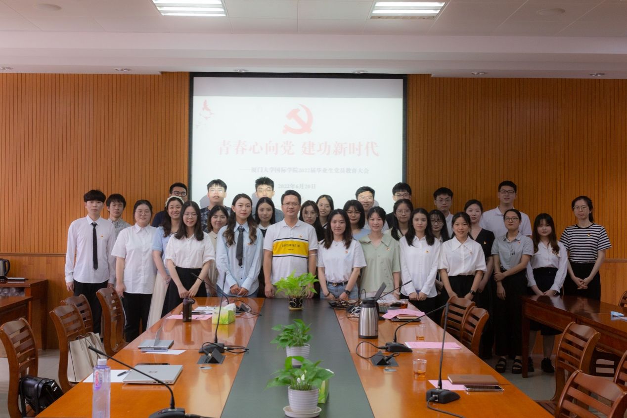 6月20日,国际学院在翔安校区坤銮楼A104召开“青春心向党,建功新时代”2022届毕业生党员教育大会。学院党委副书记陈向柳,团委书记邹文菁,辅导员吴婧、钟民栋以及2022届全体毕业生党员参加活动。