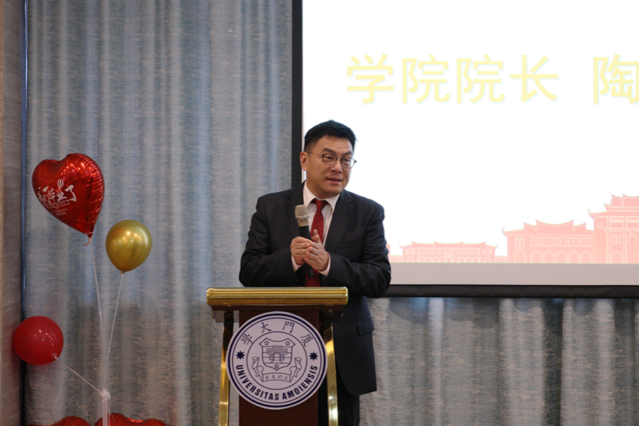 院长陶涛教授代表学院致辞,他首先为2022届顺利毕业的同学们送上了最热烈的祝贺和最美好的祝愿,向默默奉献的教师和学生家长们致以衷心的感谢和诚挚的敬意,为毕业生们在就业与升学深造上取得的优异成绩表示充分的肯定和衷心的祝贺,为毕业生们在厦门大学国际学院的成长感到自豪。他简要回望了过去四年里,同学们克服了人类历史上罕见的新冠肺炎疫情顺利完成学业,庆祝了厦门大学的百年华诞,共享了中国共产党成立100周年的百年荣光。在这四年里,在学院和学校的帮助下, 通过自身的努力,同学们德智体美劳全面发展,取得了优异成绩。同学们作为新时代自强新青年,生逢其时,又重任在肩。对此,他对毕业生们寄语了三点希望:一是希望同学们志存高远,爱党爱国,做一个有情怀的人,在奋斗中释放青春激情、追逐理想、奉献党和祖国;二是希望同学们始终坚持对学习的终身践行,把学习当作一种追求卓越的品质,培养持久的专注力;三是希望同学们爱己达人,做一个有梦想的人,心怀感恩,培养高尚的人格,正确看待自己,善待他人的诚信友善。