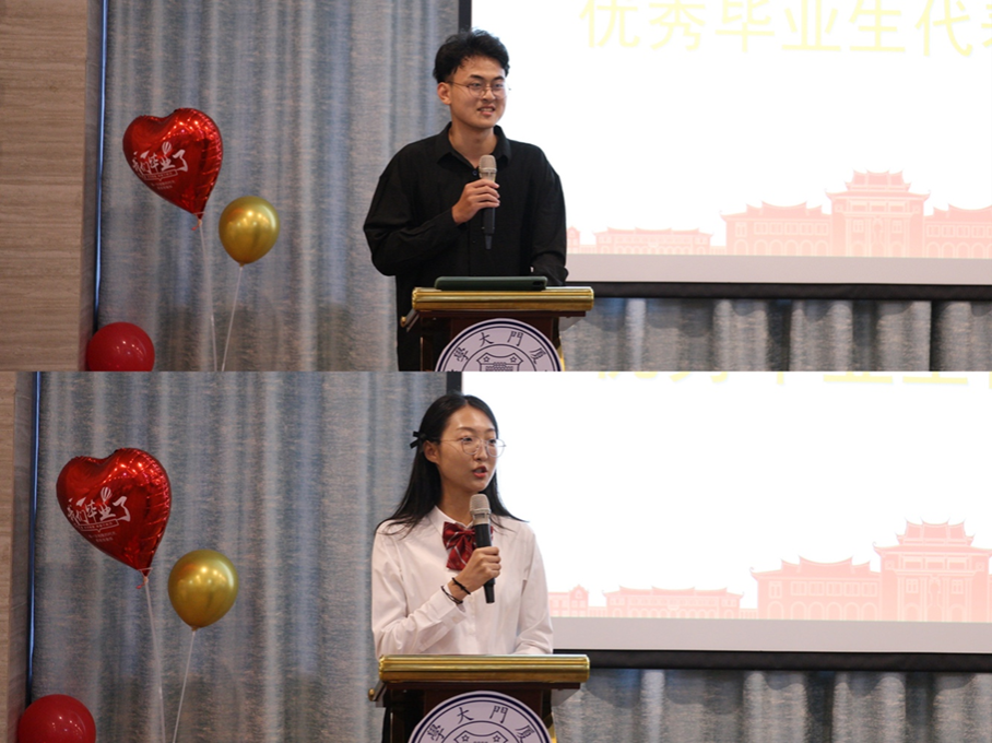 孙浩洋、王译平作为毕业生代表依次发言。孙浩洋,2018级金融学专业,毕业后将赴哥伦比亚大学深造。他回顾了四年的校园生活,表示在厦大的每一个日子都是一种经验,培养了对专业的热爱、明确未来想从事的职业;在努力中得到正反馈,突破极限、收获机会。他表示厦大永远是他骄傲的身份牌,从厦大师友中学到了不同的看待世界的视角和方法。他感谢师友的帮助,希望大家保持联系、互相成长,形成最有影响力的一批厦大校友。王译平,2018级会计学专业,毕业后将保送复旦大学(直博)。她回溯了大学生活的成长经历,学会辩证看待事物的结果、懂得经历过了便会收获成长、尽力而为便会不留遗憾。她表示将把这四年与师友的相伴化为今后前行的力量,牢记自强不息止于至善的校训。她感谢了师友的帮助,祝福学院再谱新篇章、祝福同学们前程似锦、未来可期。