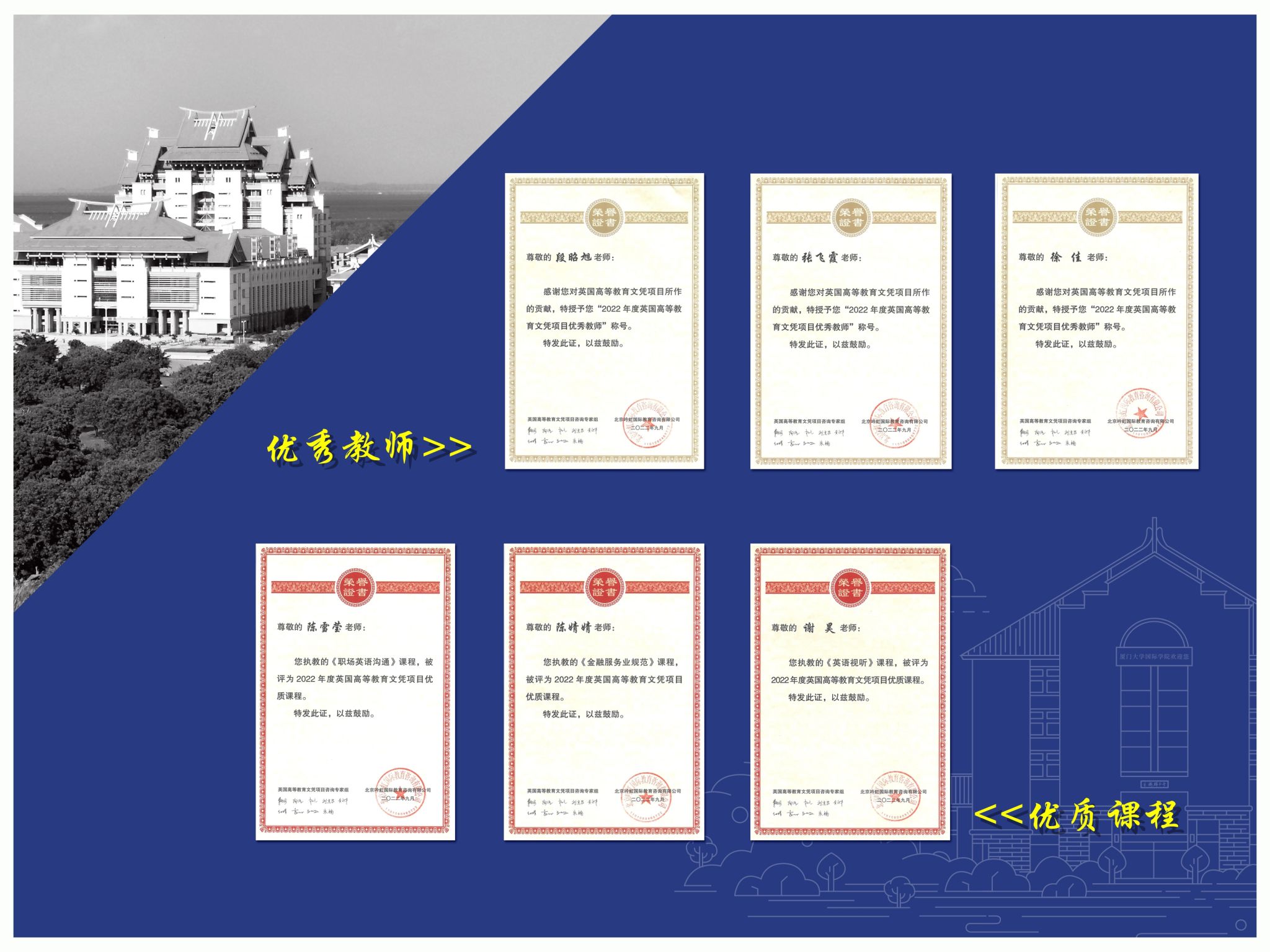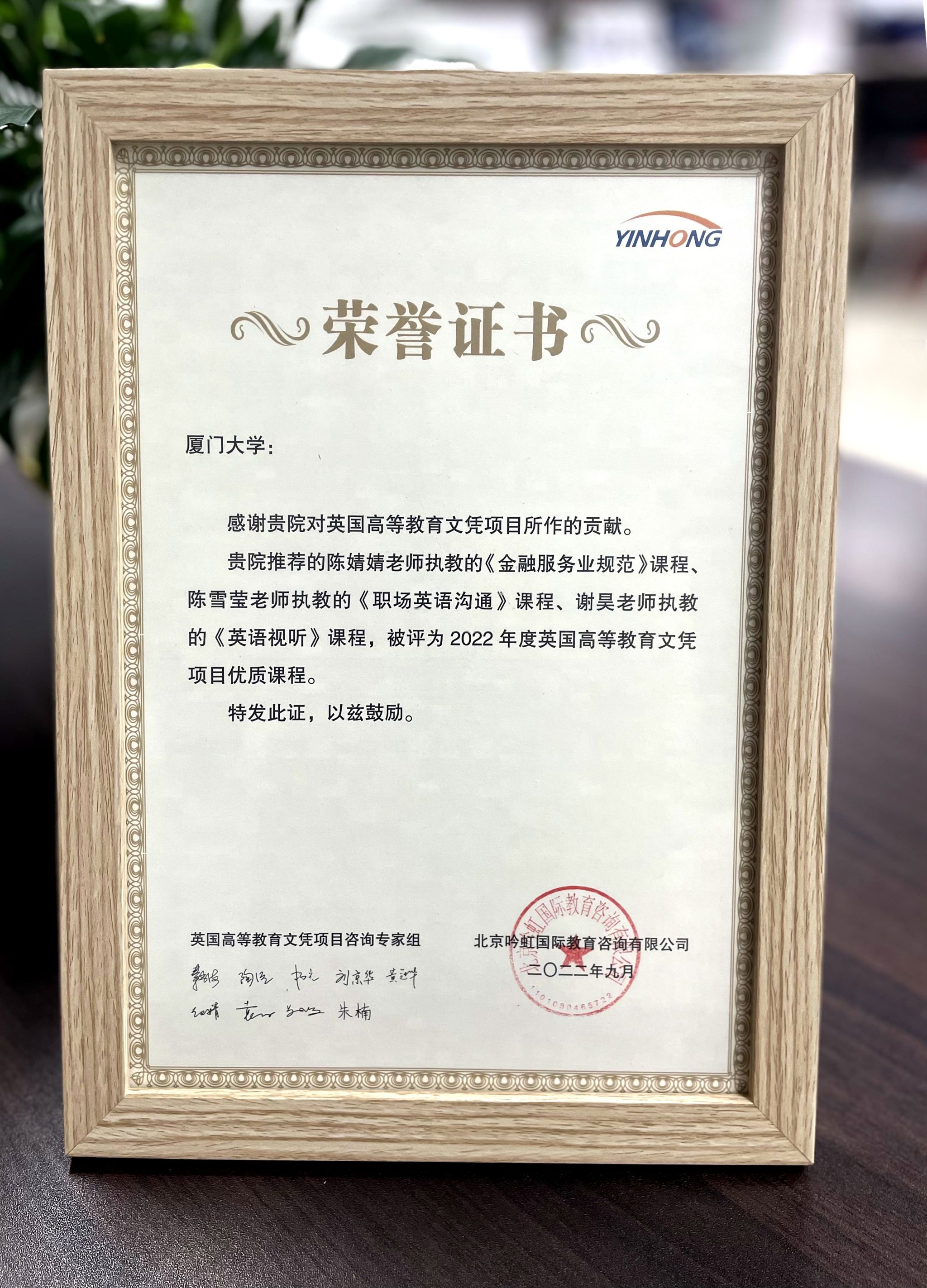 近日,2022年度教育部留学服务中心英国高等教育文凭项目“优秀教师”及“优质课程”评选结果揭晓,厦门大学国际学院共有三位教师荣获“优秀教师”荣誉称号,三门课程被评为“优质课程”。本次评选活动中,我院申报的项目全部荣获奖项,在全国院校中表现突出。组委会特为我院颁发荣誉证书,感谢学院对英国高等教育文凭项目所做的贡献。