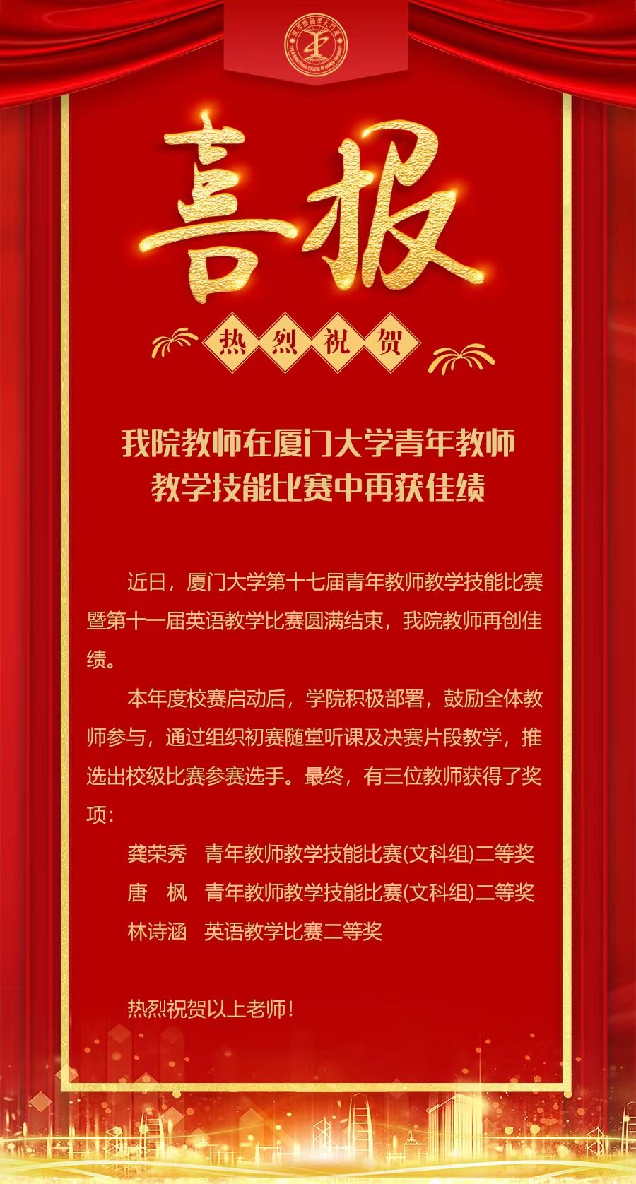 近日,厦门大学第十七届青年教师教学技能比赛暨第十一届英语教学比赛圆满结束,我院教师再创佳绩。龚荣秀老师、唐枫老师获得青年教师教学技能比赛(文科组)二等奖,林诗涵老师获得英语教学比赛二等奖。