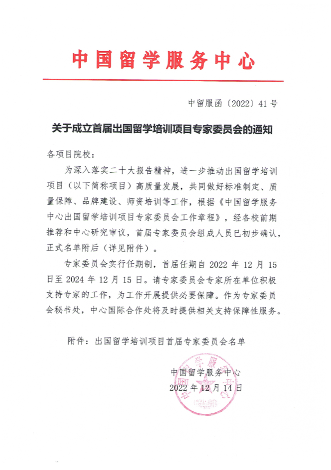 近日,教育部中国留学服务中心发布《关于成立首届出国留学培训项目专家委员会的通知》,我院院长陶涛教授受聘担任首届专家委员会专家,聘期为2022年12月15日至2024年12月15日。