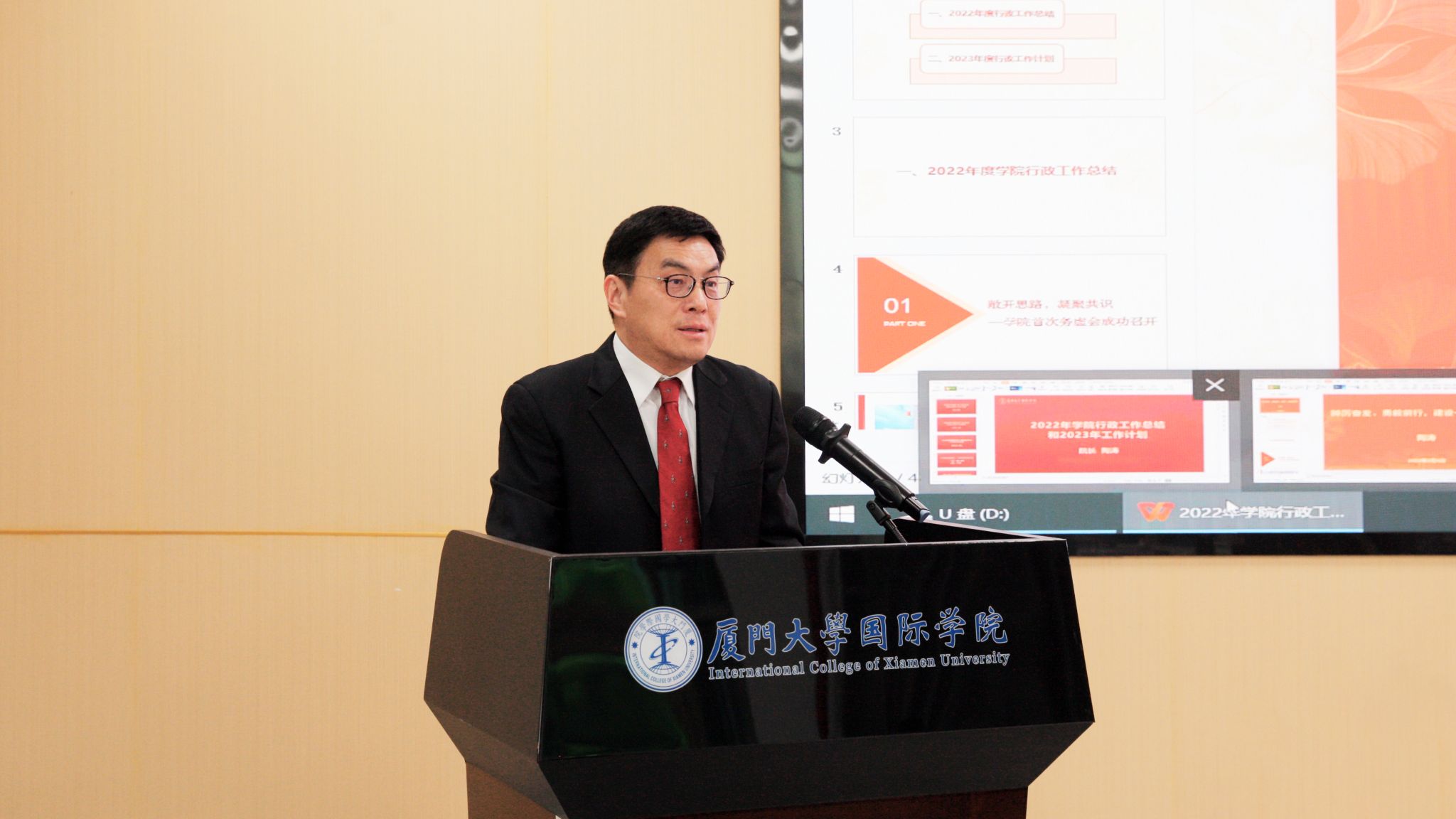 会上,院长陶涛教授以“踔厉奋发,勇毅前行,建设一流国际学院”为题对2022年度学院工作情况进行全面总结,并提出2023年学院工作计划。他指出,过去一年,学院积极应对疫情、搬迁及多校区办学等诸多挑战,通过暑期务虚会激烈的思想碰撞,进一步敞开思路、凝聚共识,推动学院各项工作逐步改革,办学条件得到根本改善,完成近30个SQA项目办学单位的调研工作,学院影响力不断扩大,获教育部留学服务中心充分肯定。学院继续以师德师风建设为抓手,不断加强师资队伍建设,注重教师职业发展,10位教师获相应职称任职资格。学院高度重视都柏林项目本科生培养工作,继续整合经院、管院等学科资源,都柏林项目办学质量进一步提升,学生升学率位列全校前茅,连续三年研究生推免成功率达100%,其中有3人被北京大学、清华大学录取,“清北”录取率创历史最高。