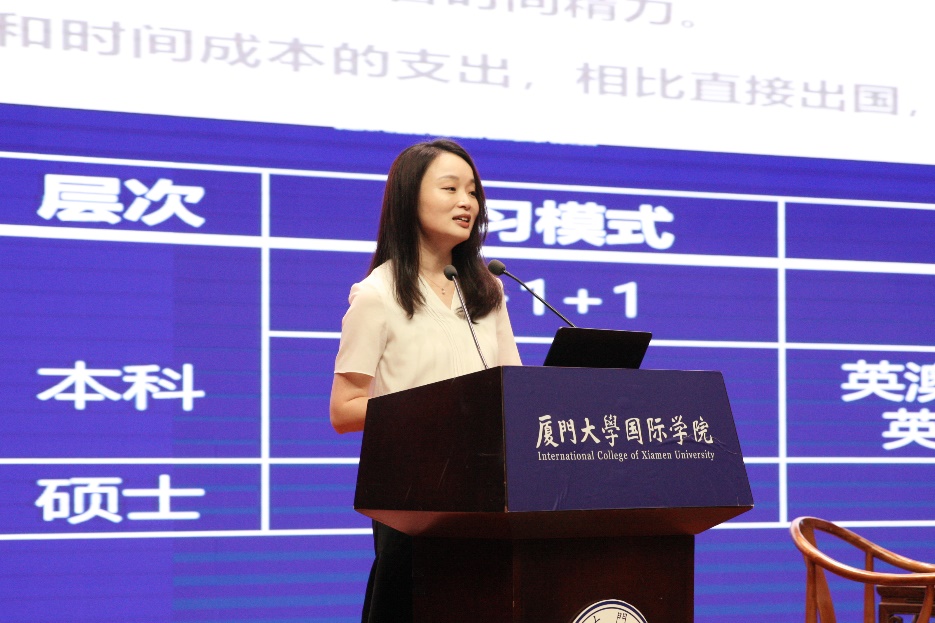 下午14时30分,校园开放日系列活动正式开始。国际学院副院长陈向柳热烈欢迎亲临活动现场的学生及家长们,简要介绍了厦门大学办学历史、漳州校区办学定位、国际学院办学理念及人才培养等情况。他指出,国际学院作为厦门大学专门从事出国留学教育的学院,充分利用厦门大学完善的教学设施和优势学科资源,与英国、美国、澳大利亚、新加坡、日本等国家的多所知名大学合作,开设了多类型的留学项目,致力于国内外优质教育的衔接,为有抱负、有理想的同学们提供了一条专业、规范、稳妥的海外升学之路。他竭诚欢迎有志出国留学的学子们加入厦门大学国际学院!
