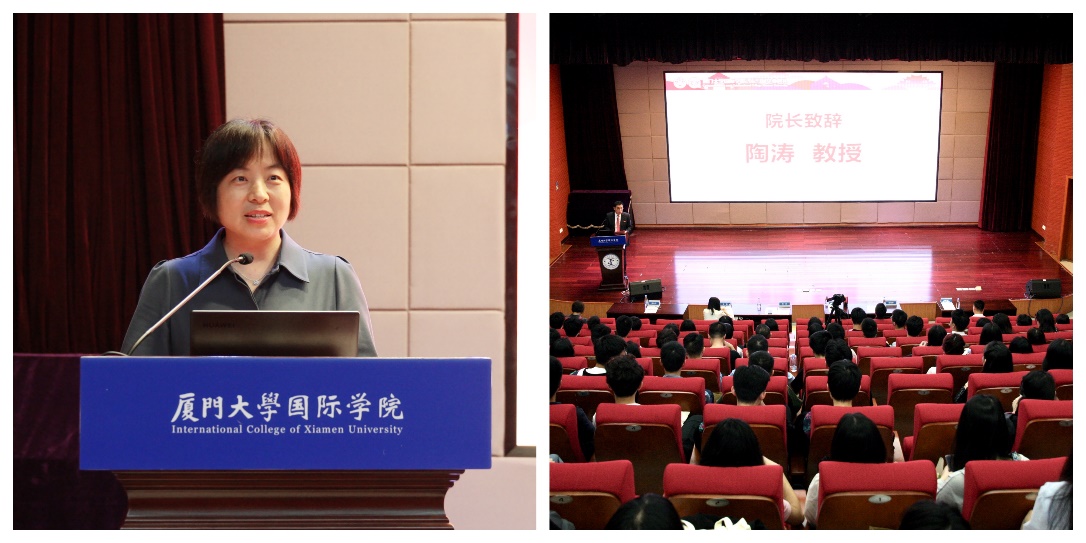 在雄壮的国歌声中,典礼正式开始。陶涛院长代表学院致辞,他首先为2023届顺利毕业的同学们送上最热烈的祝贺和最美好的祝愿,向默默奉献的教师和学生家长们致以衷心的感谢和诚挚的敬意。他充分肯定了同学们这三年来积极配合学校、学院抗击新冠肺炎疫情,克服各种困难和挑战,在升学深造与就业上取得的各项优异成绩。结合历年本科生人才培养情况,他指出,本届毕业生无论是世界百强名校录取率或是国内研究生推免率都创下了新高,总体升学率及清北录取率位居学校前茅。针对当今世界及新时代发展变革的需要,他对毕业生们寄予三点希望:一是希望同学们能坚守本心,始终牢记厦门大学“自强不息、止于至善”的校训,坚定心中理想信念,砥砺前行;二是希望同学们能永葆进取之心,培养持久的专注力,沉下心来,积淀知识;三是希望同学们能志存高远,以初心报国家,胸怀天下,将个人事业与国家事业紧密相连,在奋斗中释放青春激情、追逐青春理想。