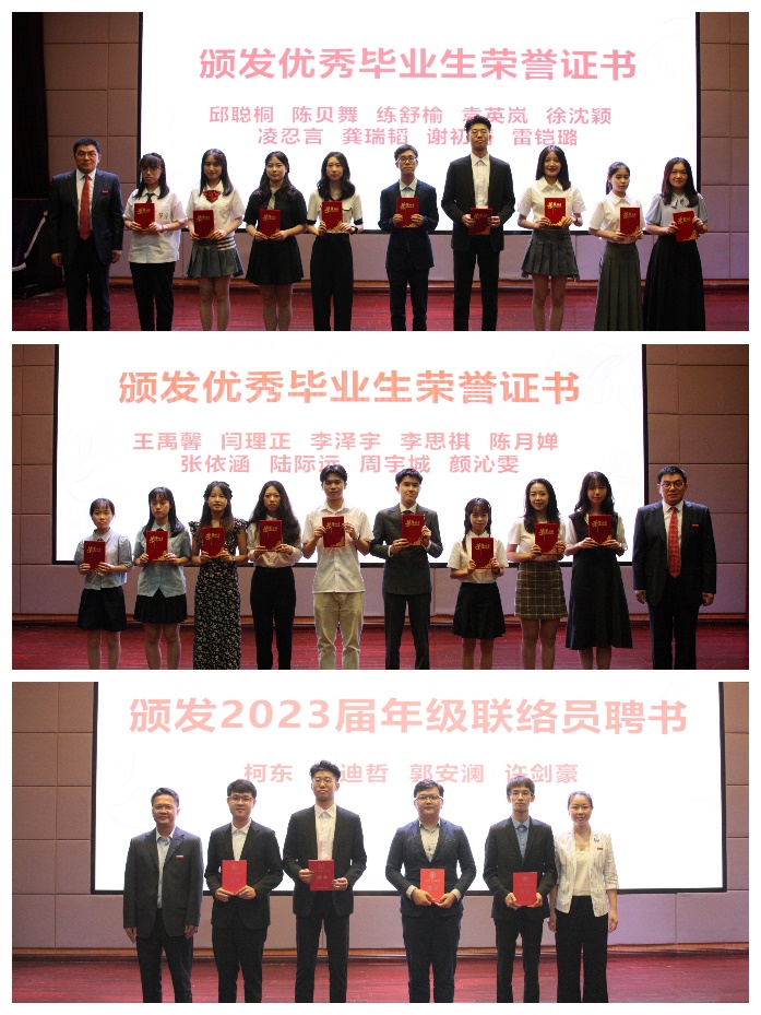 伴随着激昂的旋律,学院领导为本届优秀毕业生及校友联络员一一颁发证书,送上祝福,并合影留念。