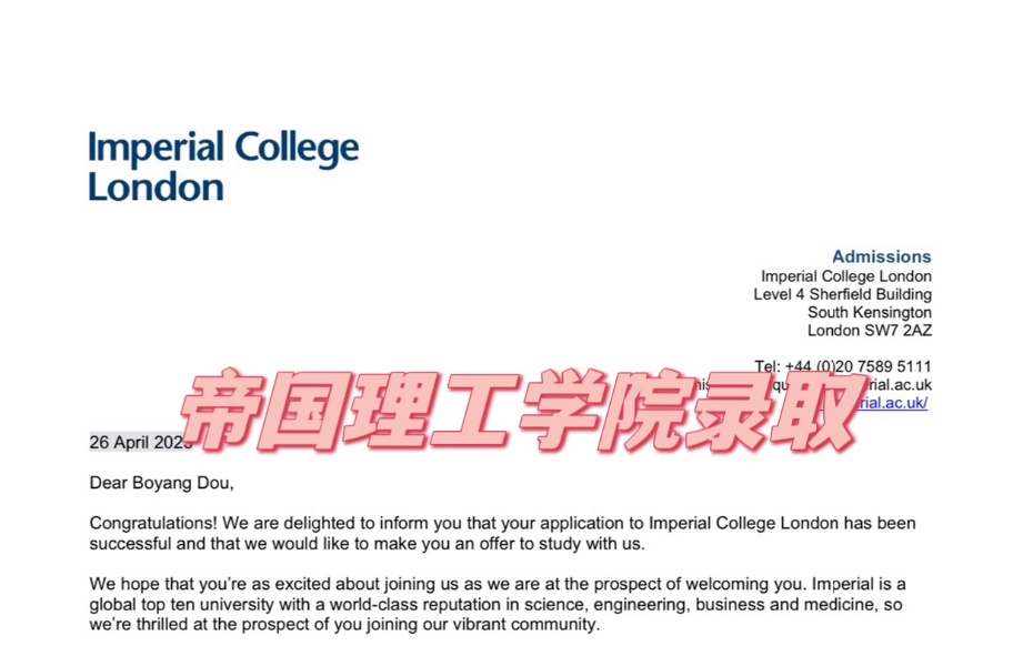 硕士院校:已获得帝国理工学院(2024年QS世界大学排名第6位)、伦敦大学学院、墨尔本大学、伦敦国王学院、布里斯托大学、华威大学等世界顶尖大学录取,即将赴帝国理工学院开启研究生学习之旅。