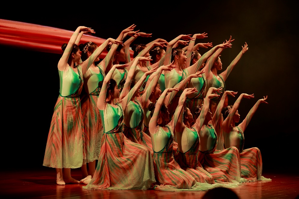 芳草萋萋,禾苗茁壮,孕育着蓬勃的生命力。舞台上,舞者化身沐浴阳光的禾苗,与风起舞,活泼灵动,昂扬向上的挺拔身姿彰显大自然生命力的顽强与蓬勃,充满了新生与希望。