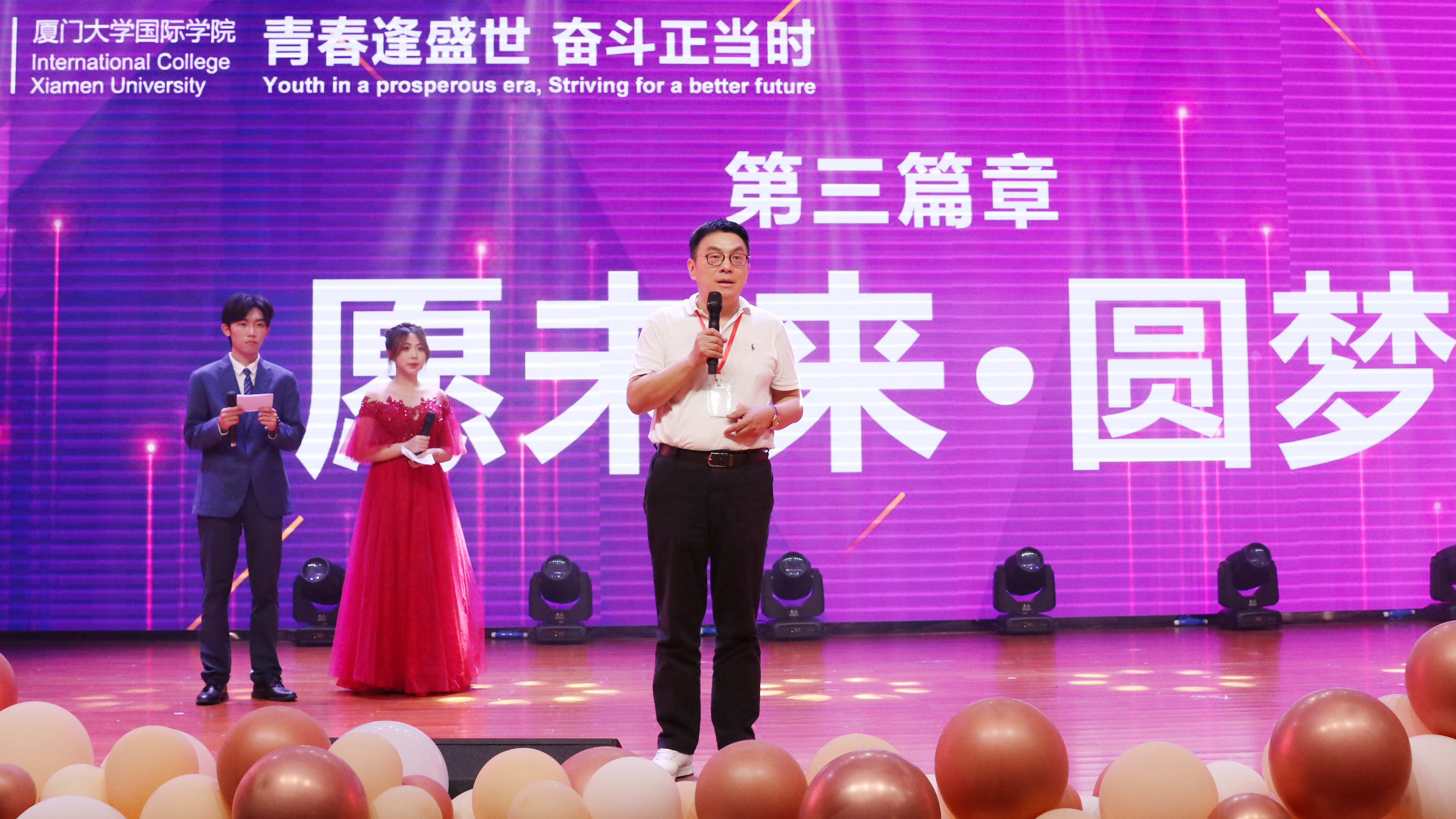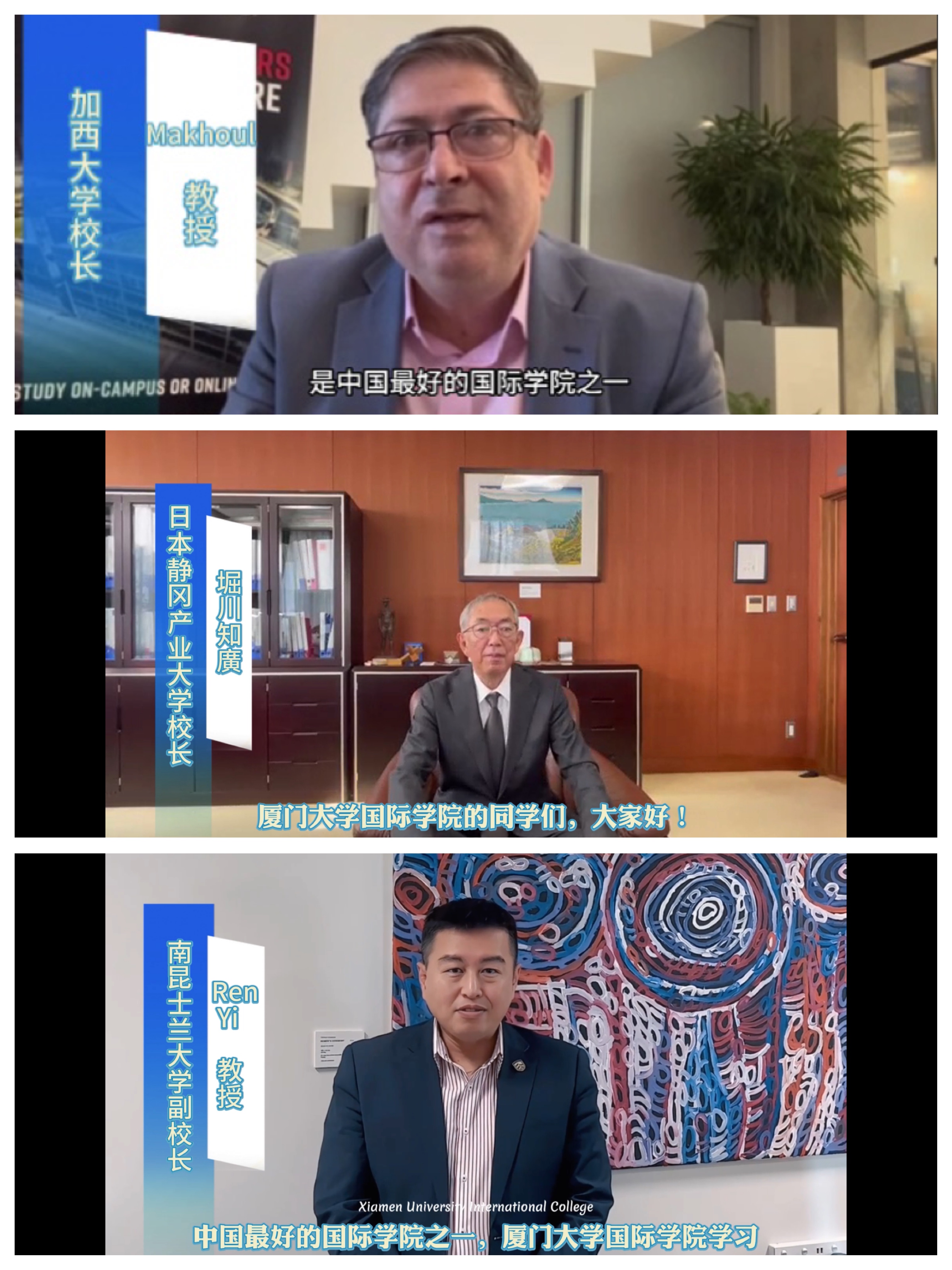 第三篇章伊始,加拿大加西大学校长Makhoul教授,日本静冈产业大学校长堀川知廣教授和澳大利亚南昆士兰大学副校长Ren Yi教授分别致辞,他们对同学们来到中国最好的国际学院之一,厦门大学国际学院表示衷心祝贺,欢迎同学们在完成厦门大学的学习后到他们的学校继续深造。陶院长在致辞中对同学们的成功演出表示热烈祝贺,为同学们在演出中展示的才华和潜力而感到自豪,感谢为晚会的成功举办而辛勤付出的师生们,他指出,举办文艺晚会,希望同学们在紧张的学习之余,能够放松自己,加强与他人的沟通交流,同时也为学生们搭建一个能展示他们潜能的平台,让同学们能充分发挥自己的聪明才智,在校园生活里演绎出最精彩的人生。