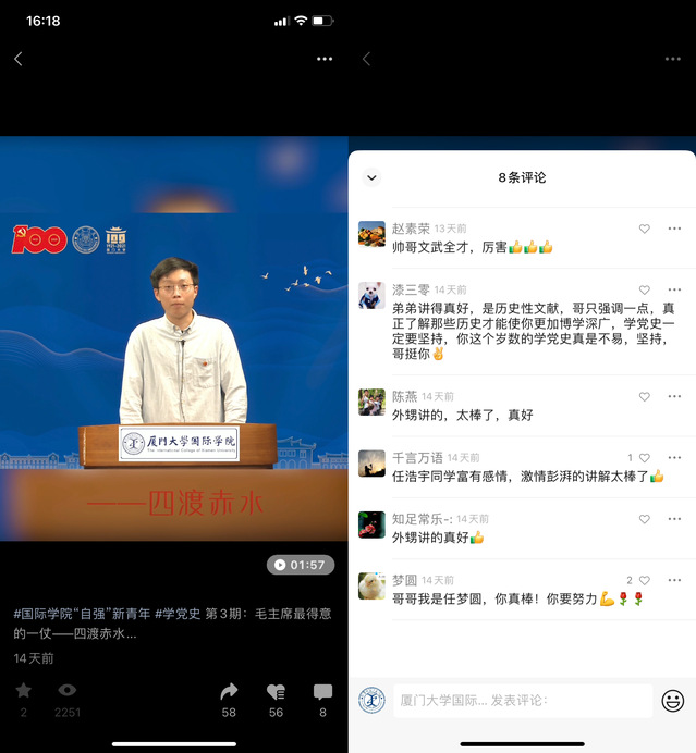 为庆祝中国共产党成立100周年,厦门大学国际学院于41日起推出自强新青年学党史系列微党课,引导青年学生分组收集党史材料,走上讲台讲授红色故事,打造精品党史微视频。在备课、讲解、剪辑的过程中,党史知识悄然沁入心田,朋辈的精彩微党课,有效地激发了同学们的学习热情。目前,学院已推出7期微党课,以生动鲜活的小故事在全院广大学生中掀起党史学习教育热潮,持续推进党史学习教育深入人心,变要我学我要学我爱学