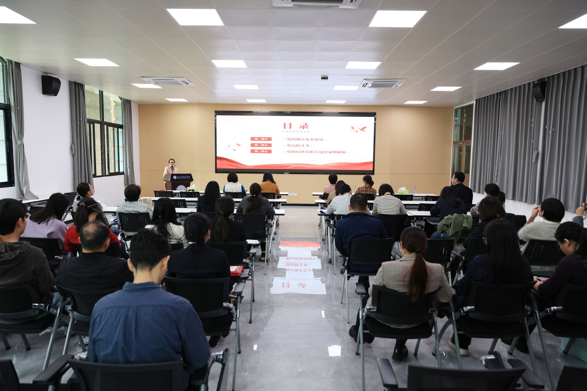 邹海燕老师以《严守纪律规矩,做新时代高校人》为题,结合《中国共产党纪律处分条例》,围绕党内法规的发展历史、党员的权利与义务、党的纪律及相关违纪案例三大方面为大家进行深入讲解,着重强调了党的政治纪律、组织纪律、廉洁纪律、群众纪律、工作纪律和生活纪律等六大纪律。她结合高校发生的违规违纪典型案例,阐释党员师生在工作、学习中的纪律红线和底线,既点明了违纪行为的表现形式和危害后果,也指出了日常工作学习中容易忽视的纪律 “盲区”,引导全体党员更加直观地了解党纪国法、校规校纪的重要性和严肃性,更加深刻地认识作为共产党员应当承担的责任和使命。