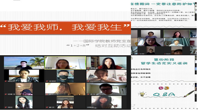 国际教师党支部组织的“我爱我师,我爱我生”交流会搬到了线上,形式变了,但是师生们的互动热情却不变。老师们给即将迈向海外留学的毕业生们上了一堂别开生面的“行前最后一节课”。准备赴海外留学的学子们开始忙着打点行装了。即将告别父母,第一次远渡重洋,第一次踏上陌生的国土,紧张、好奇、焦虑、期待的心情充满内心,在境外新冠肺炎形势依然严峻的情况下,如何保护好自己?国际学院的党员教师结对非党员教师通过ZOOM平台,老师们纷纷分享了自己的留学经验,给毕业班的学生们送上了温暖的谆谆教诲以及对未来学业的期盼和嘱托,同学们也畅谈了各自的出国计划。