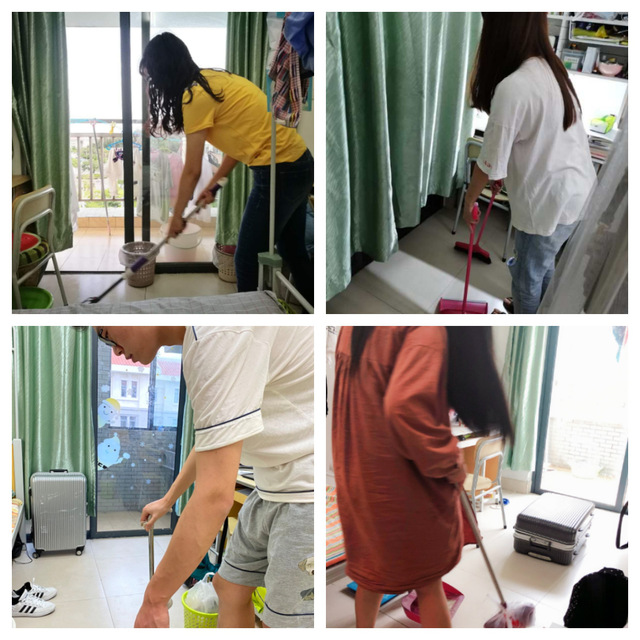 宿舍积累了许多灰尘,党员们扫地、拖地,将宿舍打扫的焕然一新