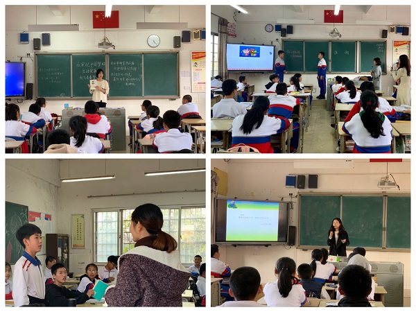 初一(1)班的教学内容以苏轼的《惠崇春江晚景》作为切入点,志愿者从同学们熟知的“东坡肉”说起,讲解苏轼生平轶事,解读其作品中的名句。在“看图猜诗”的游戏阶段,同学们积极参与互动,根据图片信息准确地说出所学的对应诗句,强化记忆与理解。在本次课开始之前,志愿者们制定了课堂规则,建立了奖惩机制,课堂纪律得到了改善,教学效果得到了显著提高。