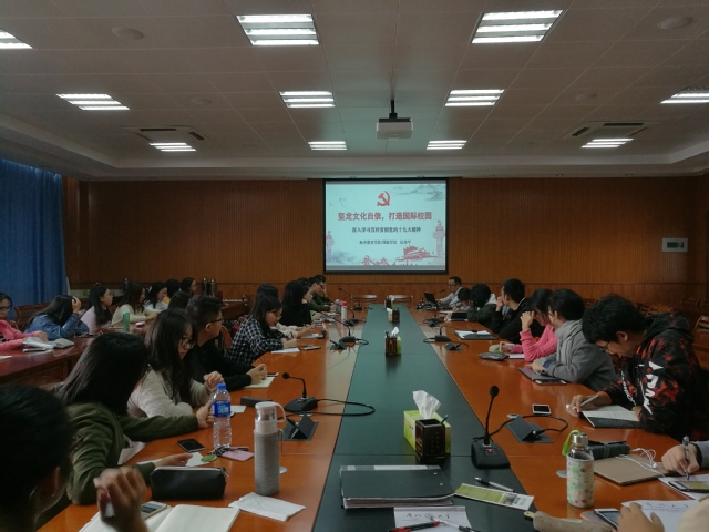 12月1日中午,海外教育学院/国际学院党委在坤銮楼A104会议室举行二级党校“深入学习贯彻党的十九大精神”专题党课。学院党委副书记伍伟平为海外教育学院2017级研究生党支部和国际学院本科生党支部全体党员及发展对象解读了十九大主要精神,并围绕“坚定文化自信,打造国际校园”与大家分享学习体会,总结经验,为下一阶段的学生党建与思政工作打好基础。