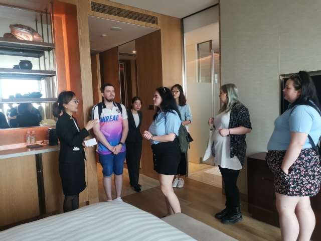 A:作为酒店管理专业的学生,能到康莱德酒店了解酒店的运营情况,是一次很难得学习机会。酒店人力资源部林经理全程接待我们,带我们参观了酒店不同的部门及客房。这里面也有一个小细节让我印象深刻,当时我们人数比较多,一部电梯坐不下,接待我们的工作人员就一个人先带我们上去,另外一个人就留下来等下一批人。整个参观的过程中,接待人员都是一人在队伍的前面,一人在后面跟着,非常默契非常专业。