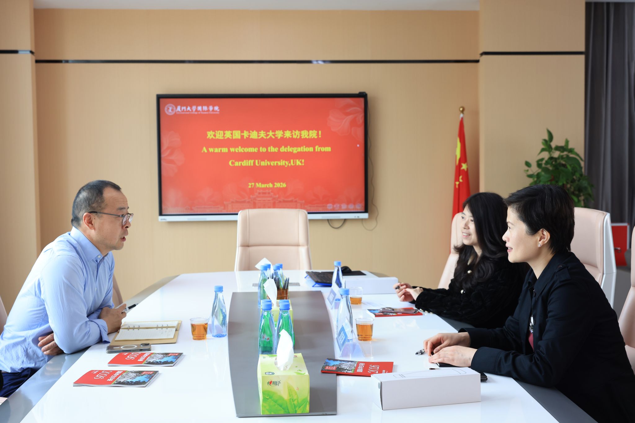 在与卡迪夫大学代表的座谈中,双方围绕2+2国际本科出国留学培训项目的落地实施展开务实磋商。卡迪夫大学作为英国罗素集团成员、享誉全球的研究型学府,与厦门大学在师生互访、学术交流等方面已有深厚合作基础。刘兴飞老师介绍了该校优势学科及2+2项目的课程衔接与优势特色,充分肯定我院办学质量,期待项目早日落地。余宏波院长表示,2+2项目是我院历经多年实践检验、深受学子认可的成熟育人模式,此次合作既是两校友好合作的延续,也将在国际化人才培养领域实现新突破。学院将全力推进项目筹备,确保项目平稳落地、高效运行。