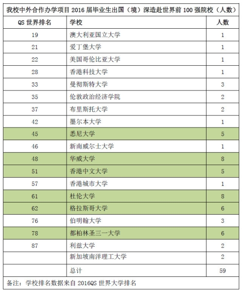 今年,我校中外合作办学项目,与美国开普兰 (Kaplan) 教育集团旗下爱尔兰都柏林商学院开展金融与会计合作办学两个专业的2016届毕业生们又交出了一份不俗的成绩单:截止6月20日,本届113名毕业生当中,73名同学升入国内外著名大学攻读研究生,其中,国(境)外高校65名、国内名校8名;另有27名同学已签署就业协议,部分同学已有意向工作等待进一步落实。就业及读研人数占毕业生总人数的93.8%,在全国高校毕业生就业管理与监测系统中一度高居全校第二。总体来看,我校中外合作办学项目的毕业生们在国际国内广受青睐,其升学及就业优势突显。