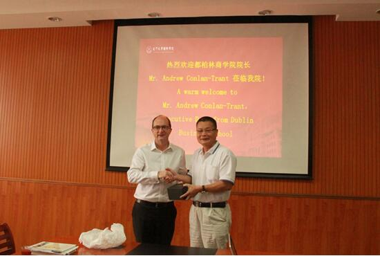 Andrew校长对我校与爱尔兰都柏林商学院合作举办金融学、会计学专业本科教育项目的成功合作表示高兴,对我院的热情接待表示感谢,同时就都柏林商学院的优势专业、学生培养、办学成果以及国际化办学情况进行了介绍。他充分肯定了两校合作的良好基础,以及我院学生的综合素质。他说,在都柏林商学院,中国学生是一个非常优秀的群体,国际学院首批赴都柏林商学院的27名学生当中,有21名学生取得了一等学位。还有学生被爱尔兰教育部授予爱尔兰“国际学生大使”称号。他对两校合作办学充满信心,未来将加大合作项目师资投入和教学资源共享。