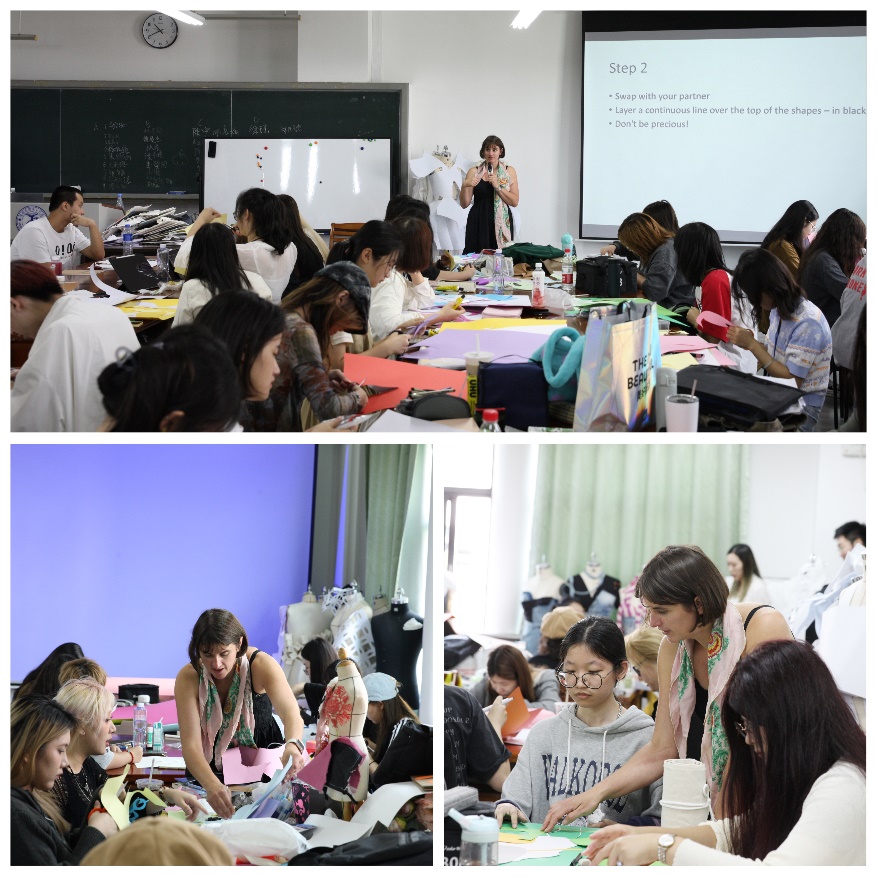 代表团一行首先来到我院艺术工作室,为中英艺术设计项目学生开设了一堂生动的工坊体验课。作为温彻斯特艺术学院资深讲师及面试官,Rosann Murray-Langdon 女士有着丰富的面料设计教学及行业经验。她通过对面料的解构和拼贴,帮助学生们理解艺术形式的多样化,传授了许多面料设计的技术手法;她进一步强调了艺术创作系统性流程的重要性,指出从头脑风暴到实现创意需注意的步骤和思考过程。