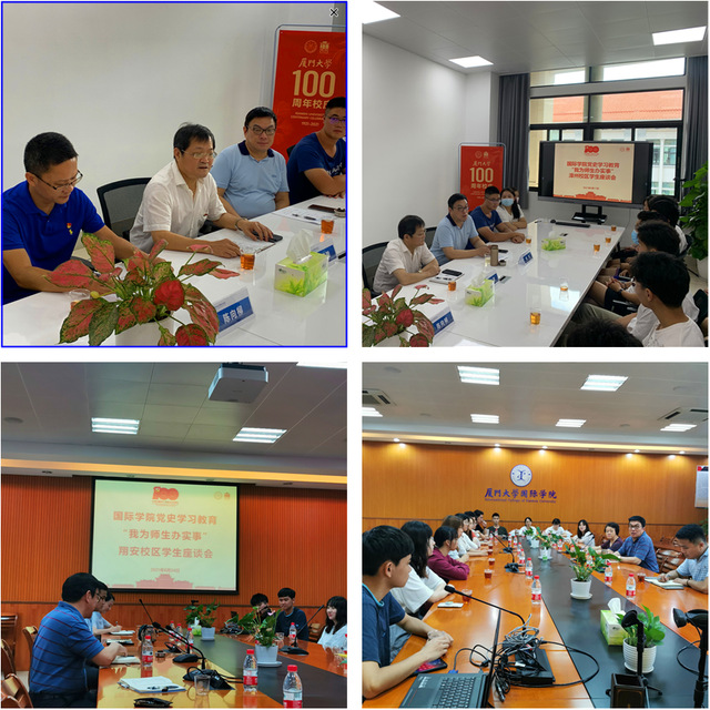 为贯彻落实学院党史学习教育“学党史、悟思想、办实事、开新局”的要求,切实了解师生需求,解决学院教学管理过程中存在的实际问题,推动党史学习教育走深走实。学院于6月17日、6月24日分别在漳州校区、翔安校区召开了国际学院党史学习教育“我为师生办实事”学生座谈会。学院党委书记何元赞、院长陶涛教授、党委副书记陈向柳、副院长黄冠华、各部门相关工作人员以及学生代表参加座谈会。