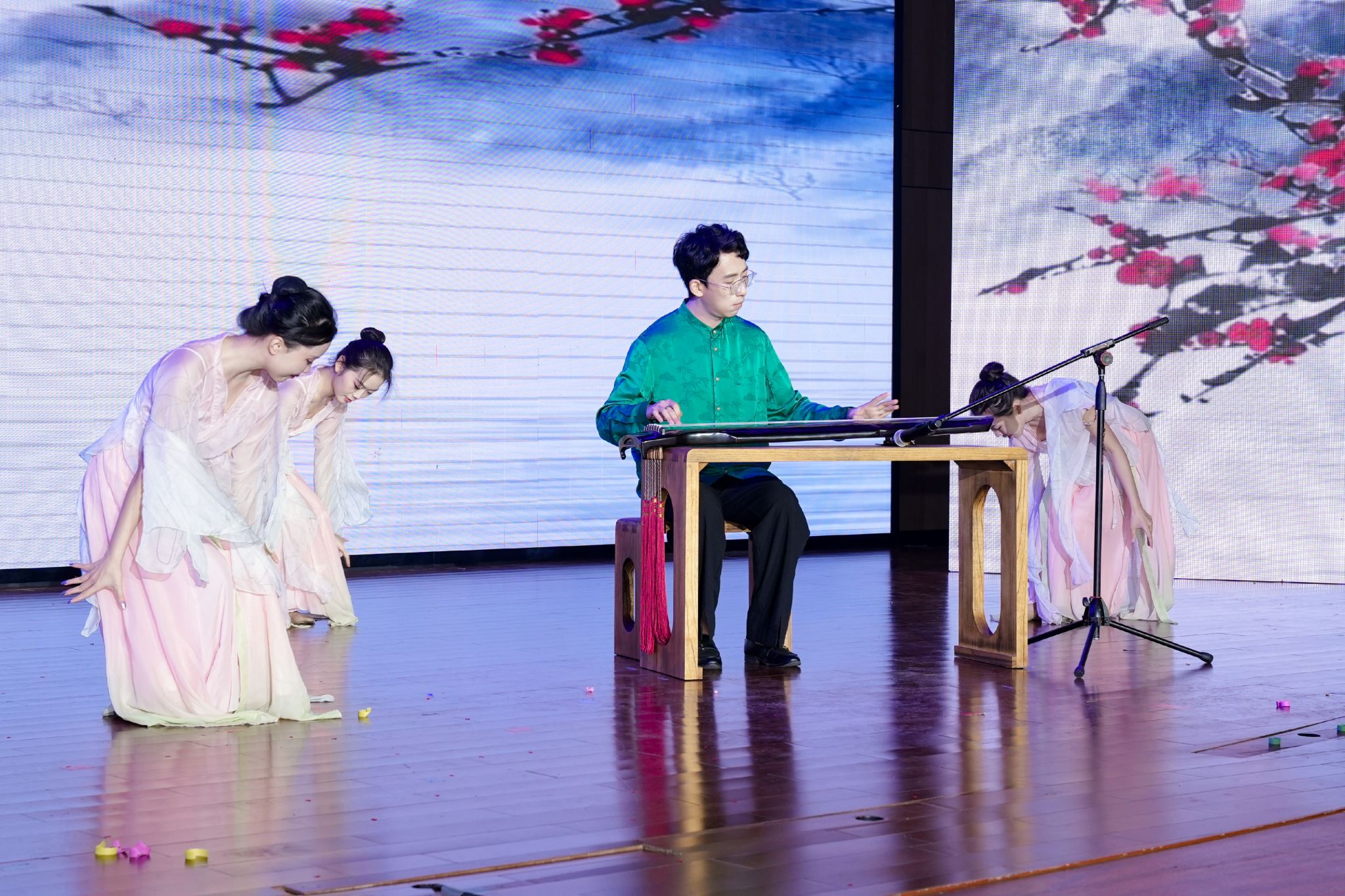 古琴《梅花三弄》琴音清越,为晚会注入一缕千年风雅。琴韵梅魂,交织出学院二十载风雨路上不变的初心与坚韧,象征着学子们坚韧不拔的精神与芬芳自许的追求。