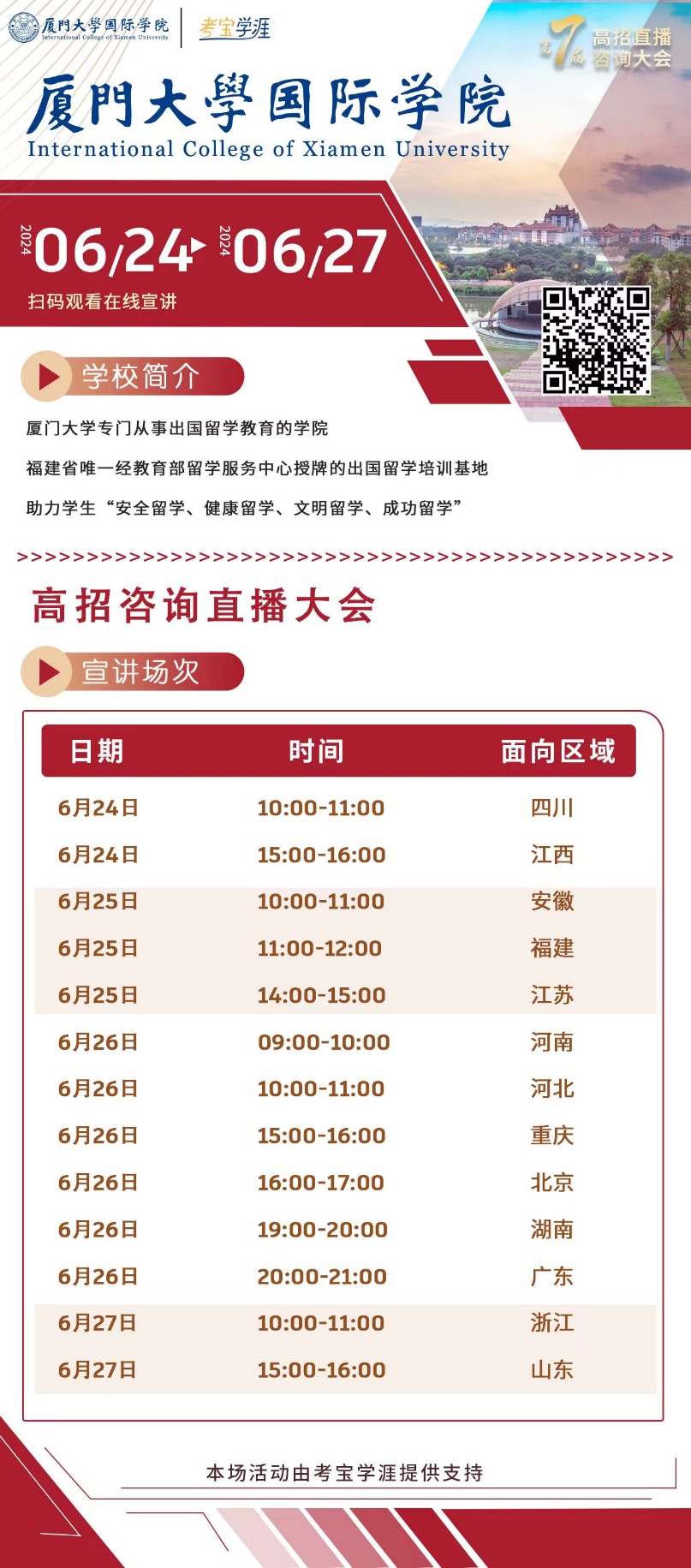 想了解更多厦门大学国际学院2024年招生政策,赶紧拿起手机扫码参加厦门大学国际学院招生直播宣讲会吧!