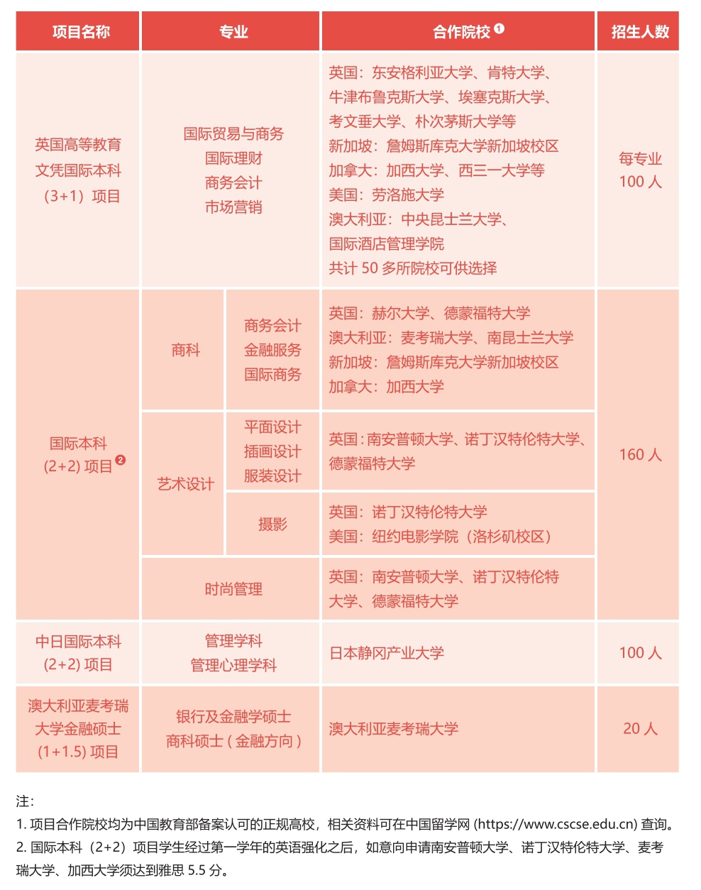 厦门大学国际学院与英国、美国、澳大利亚、新加坡、日本等多个国家的多所知名大学合作3+1、2+2等多类型留学项目,设有国际理财、商务会计、艺术设计、时尚管理等热门专业,为学生提供丰富的留学选择。