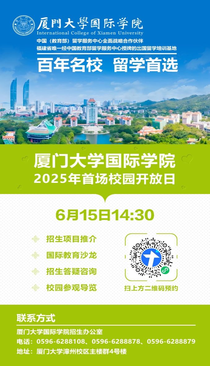 百年名校,留学首选——厦门大学国际学院2025年首场校园开放日即将启幕!在这里,您可漫步中西合璧的学苑小径,触摸国际化教育的脉搏;倾听老师们解读前沿培养体系,让未来的学术蓝图在咖啡醇香与海风轻抚中渐次清晰。