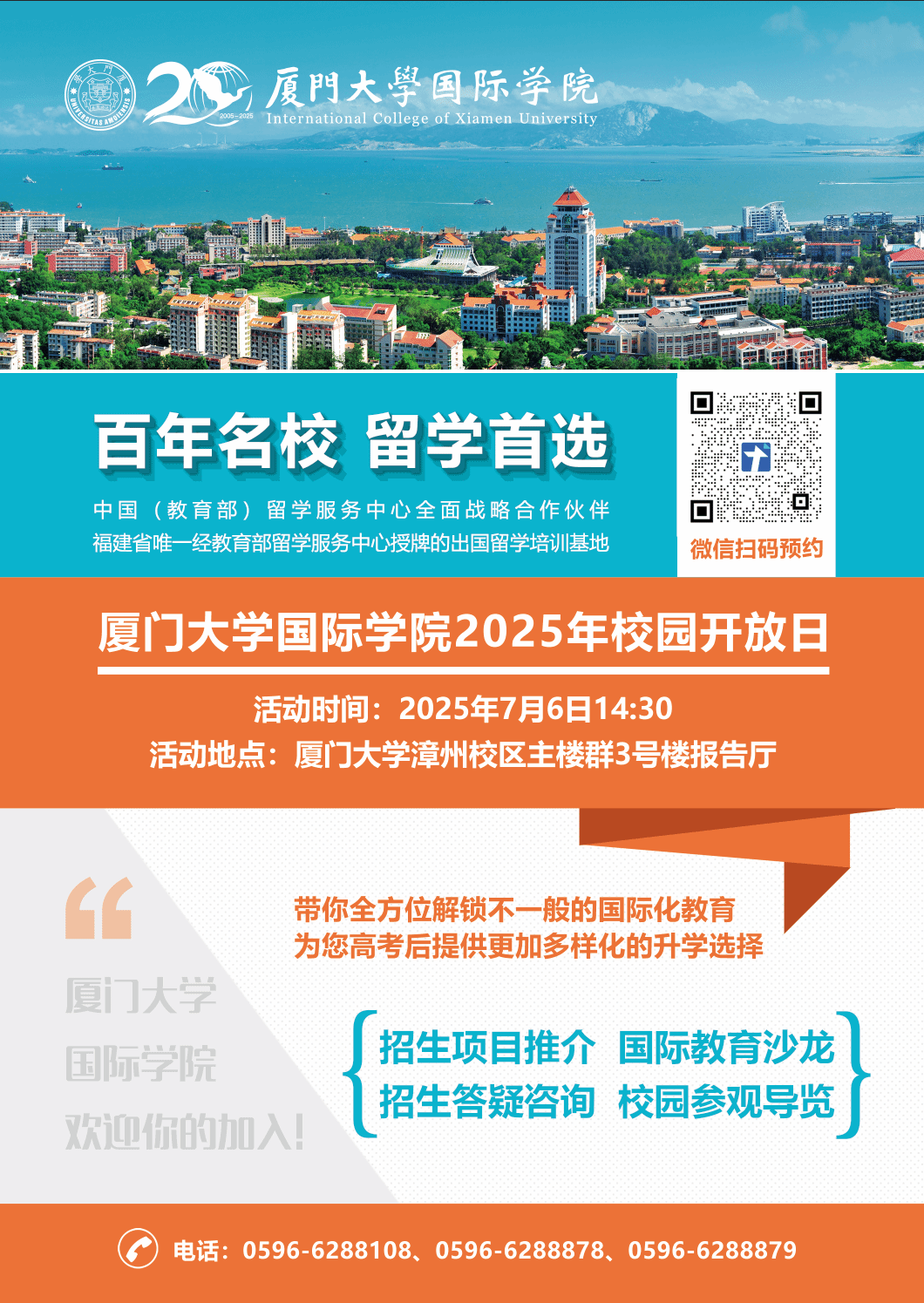 厦门大学国际学院2025年校园开放日盛邀莅临!7月6日14:30,邀你走进百年学府,从高考到世界舞台,这里为你铺就多元升学通道,让名校基因与国际视野在此碰撞,带你全方位解锁不一般的国际化教育。