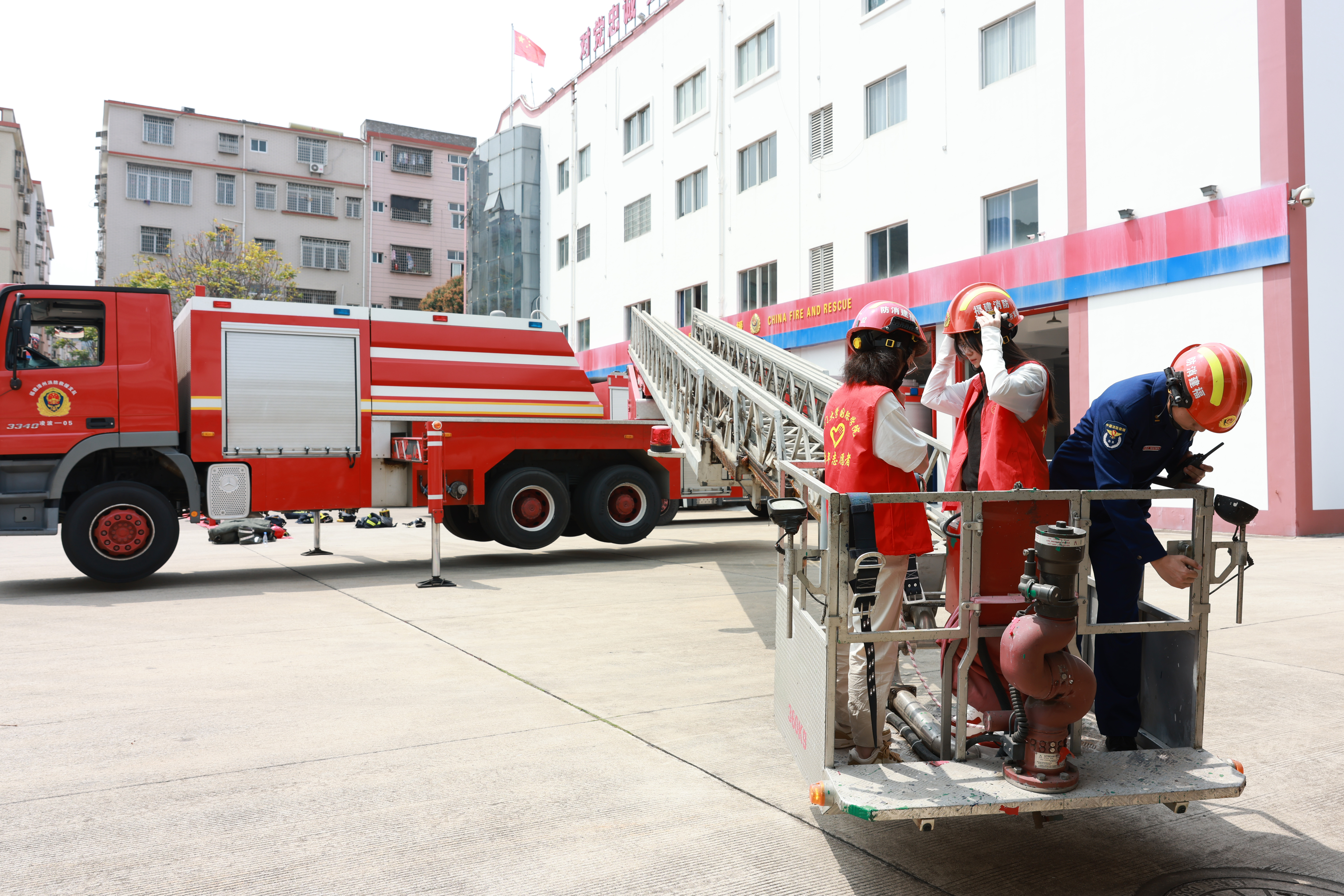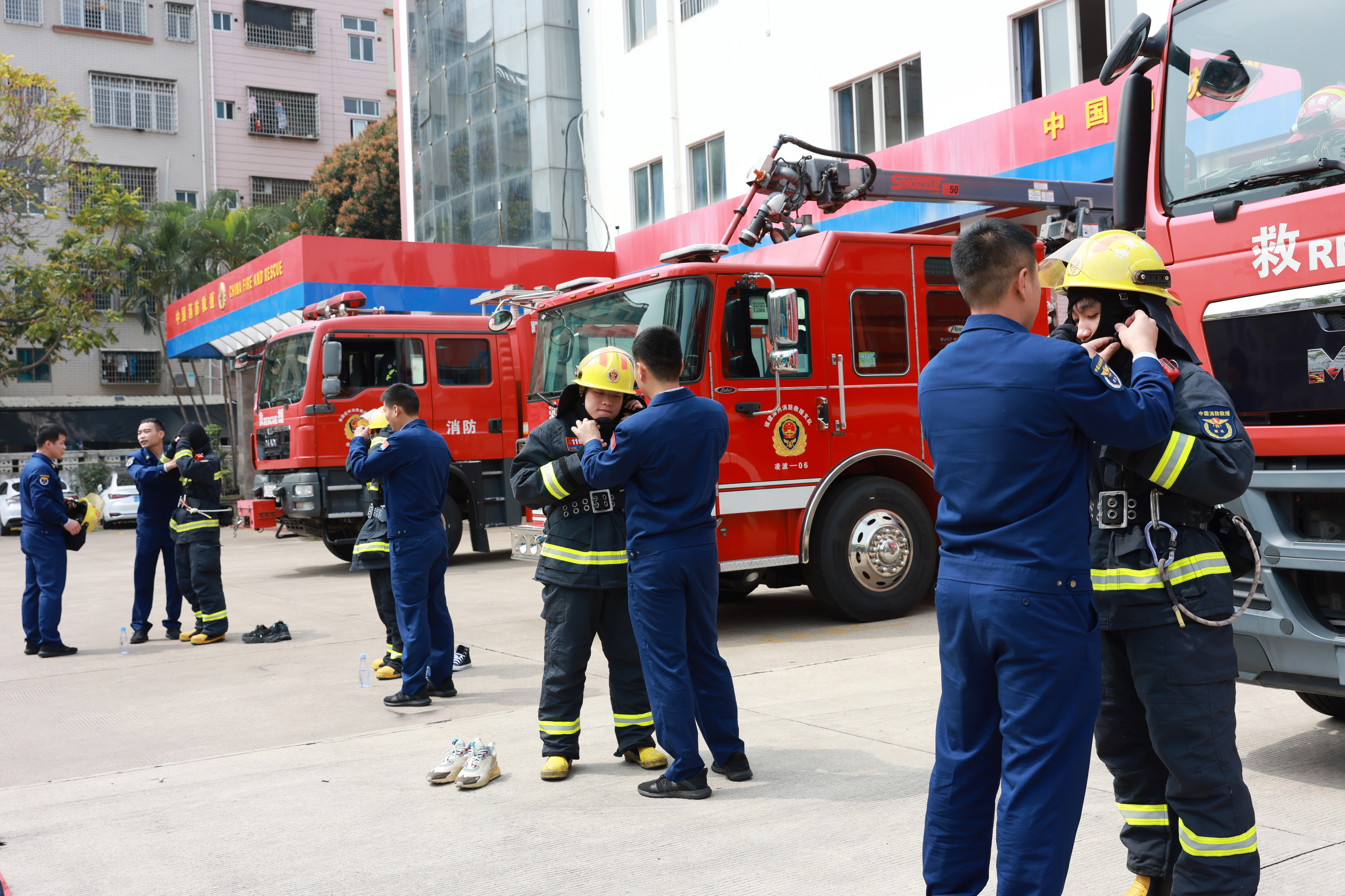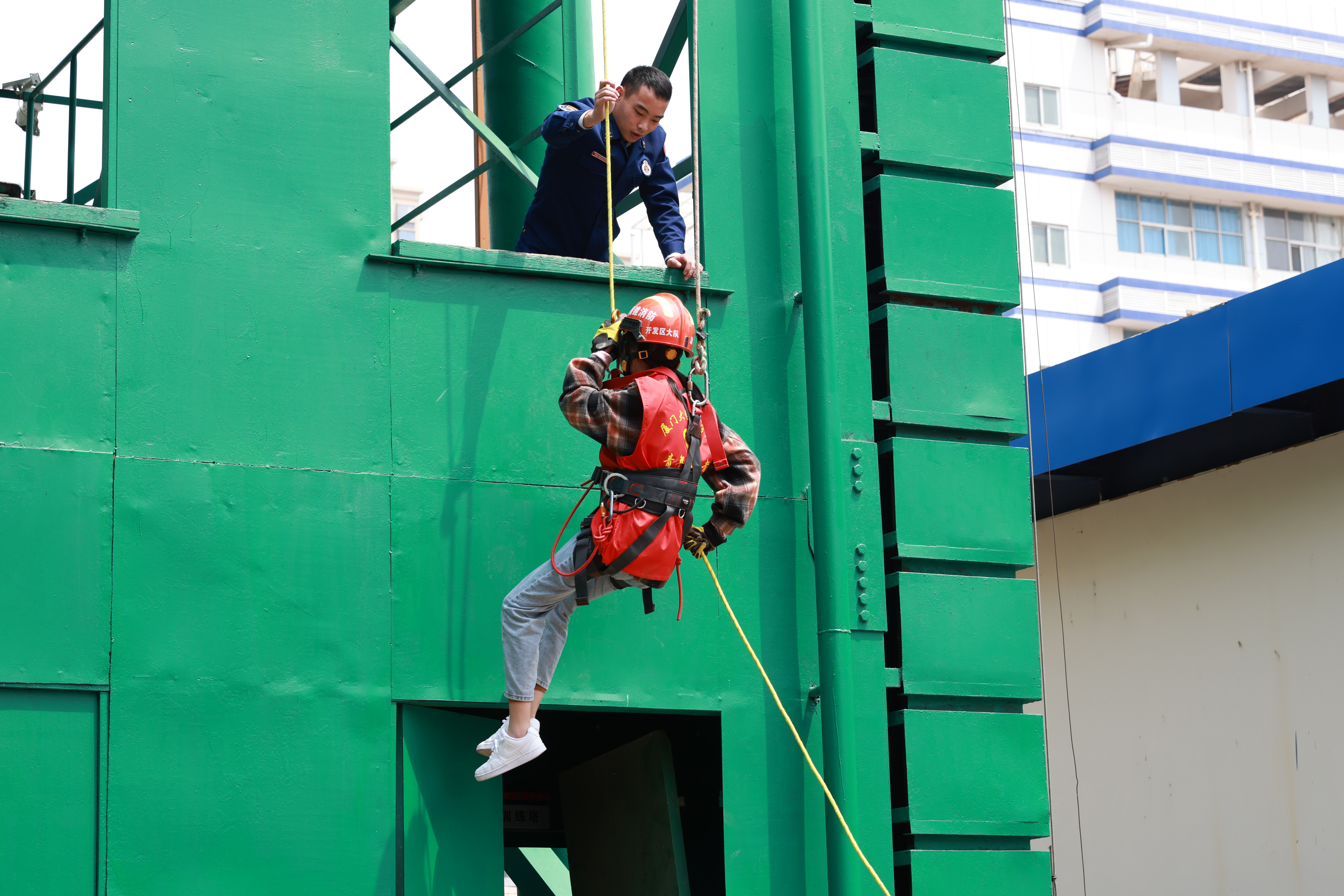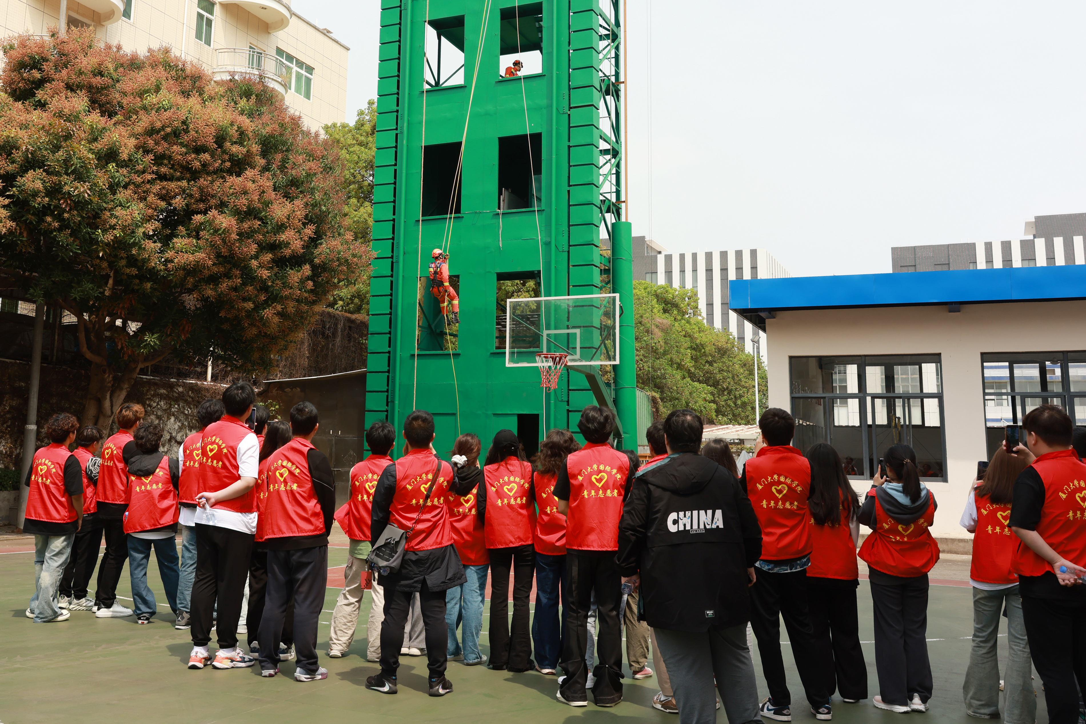 随后,大家一起观摩了消防救援队的日常训练,消防战士现场演示绳索攀爬、高空索降、云梯搭救等,尽显“强本领能战斗、践宗旨保民安”使命担当的英雄本色。