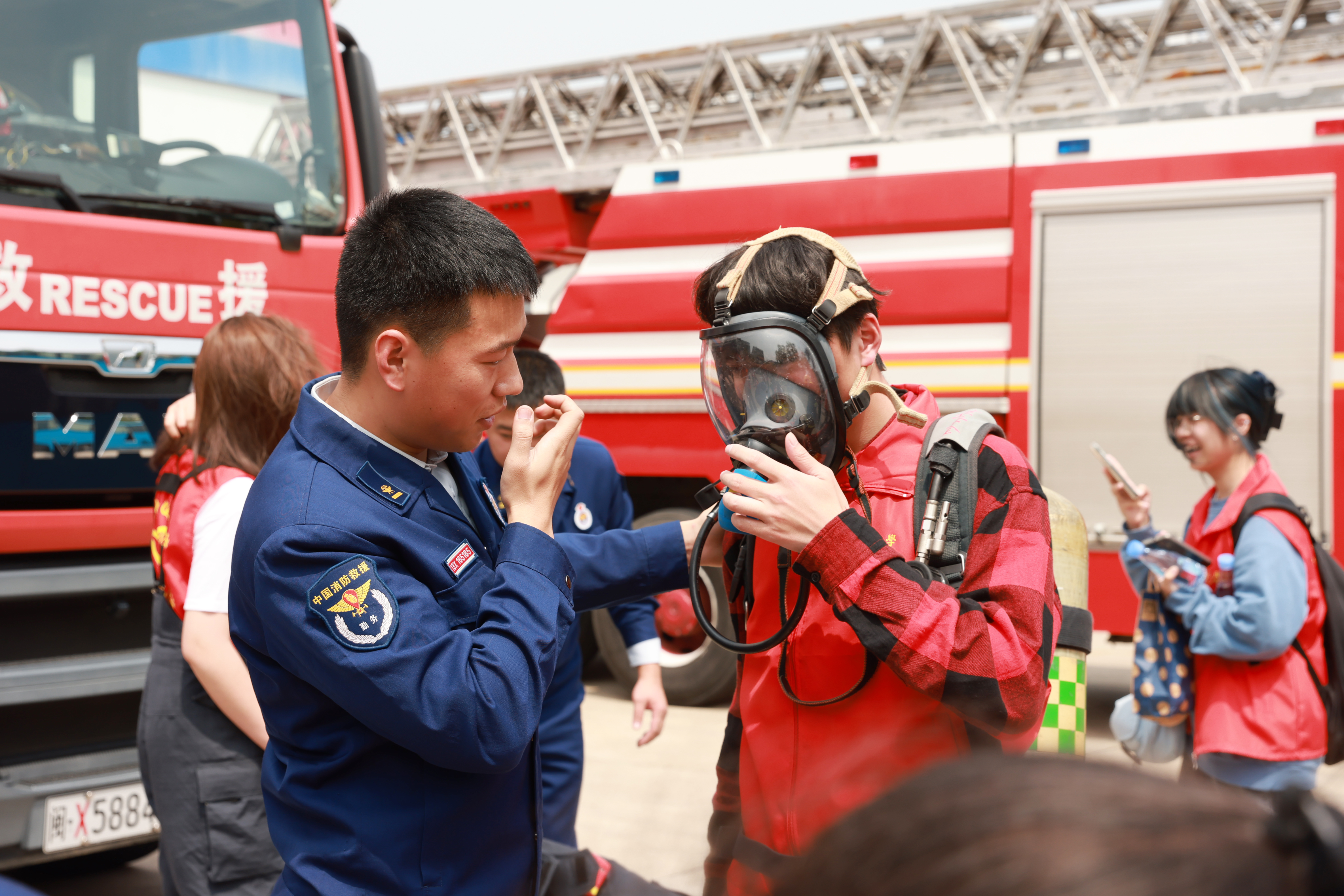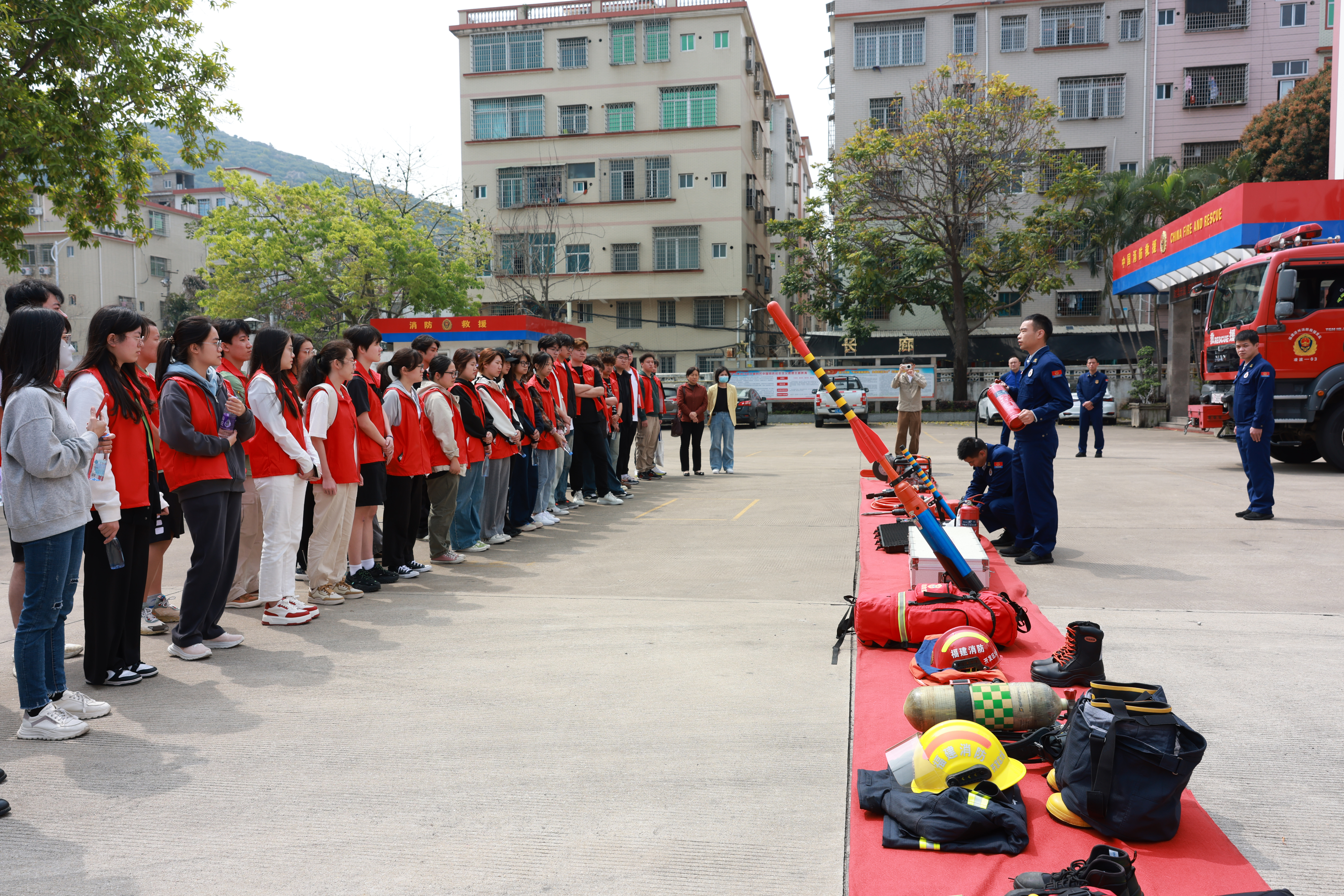 活动伊始,消防官兵们首先向师生们普及有关消防安全的基本知识,逐一讲解灭火器、指环切割器、救生抛投器等消防器材和抢险救援等设备的用途及使用方法。同时,消防官兵们还现场演示了如何正确使用灭火器、穿戴消防战斗服和空气呼吸器,并指导师生们体验穿戴战斗装备。通过实践,大家切身体会到了消防战士在火光中逆行的艰辛与勇气。